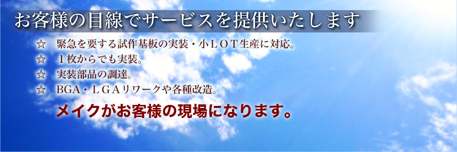 プリント基板、一枚から高品質、短納期で実装いたします。 実装工程で発生する定数変更、欠品処理、改造など柔軟に対応できるスキルとノウハウを備えています。 きめ細かくお客様のご要望にお応えできます。 |
